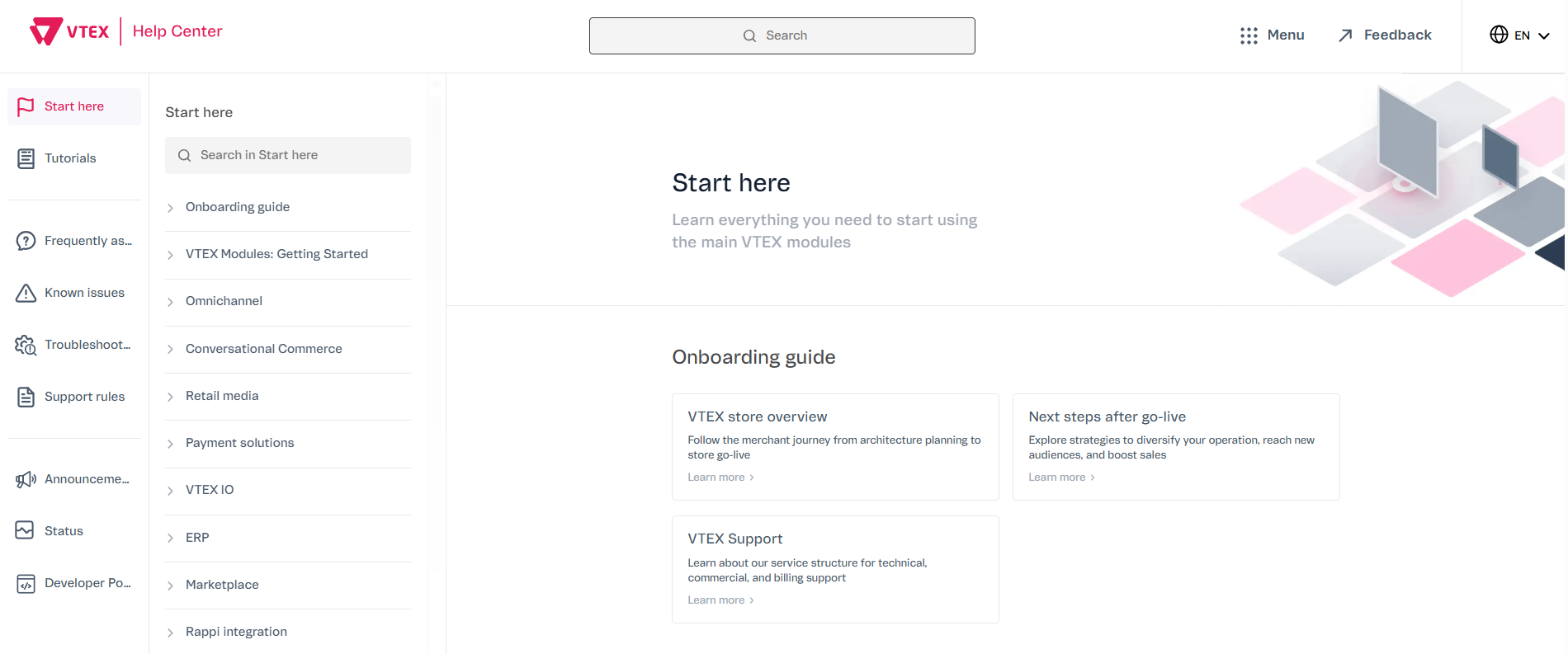 VTEX has just launched a new Help Center, featuring a lighter interface design, enhanced search, and other updates. The goal is to improve your experience with our documentation by combining high-quality information with a refreshed look and a portal offering more functionality.