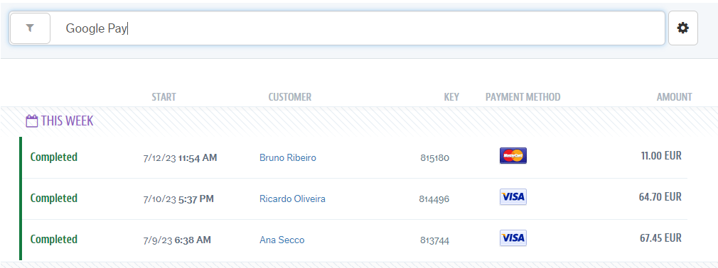 To view transactions that have been completed with Google Pay, please follow the steps described in the article Viewing transaction details. In the search bar of the transactions page, type Google Pay to filter the transactions carried out with this type of payment.