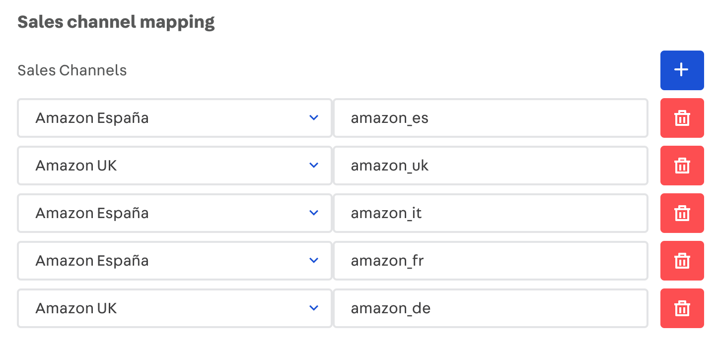 For each sales channel, select the trade policy that should be used in the left column and fill in the sales channel identifier for Lengow in the right column. We recommend combining Marketplace names and country codes in the sales channel identifier, as this will make it easier to organize your data in Lengow. For example, Amazon UK would be identified as amazon_uk.