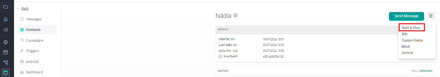 After selecting the message, simply click the ""Trigger Flow"" button located in the upper right corner of the screen and send it to a specific contact or a group of contacts.