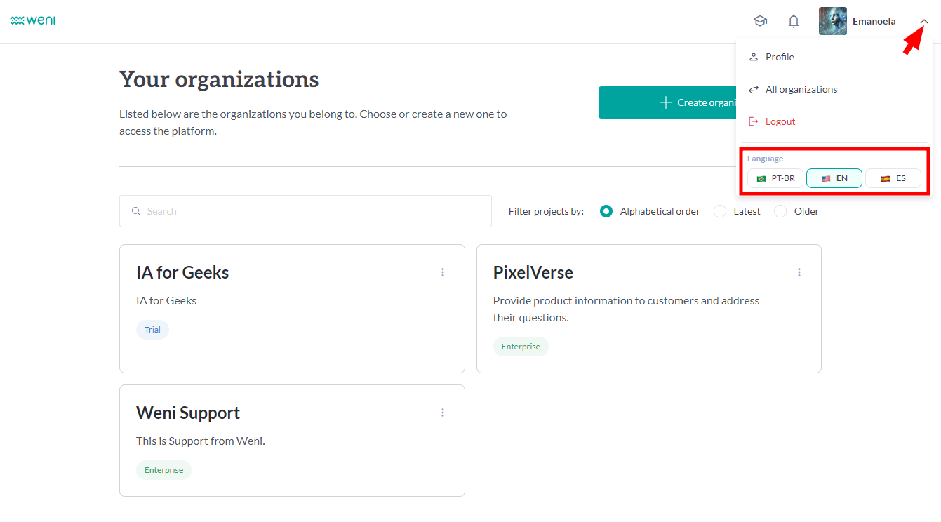 Currently, the platform is available in Portuguese, English, and Spanish. In this guide, we will show you how to select your preferred language.