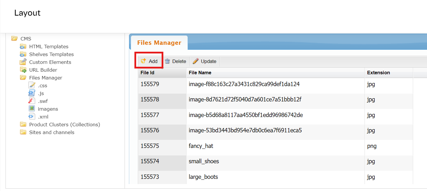 1. In the VTEX Admin, go to Storefront > Layout > CMS > Files Manager > images.