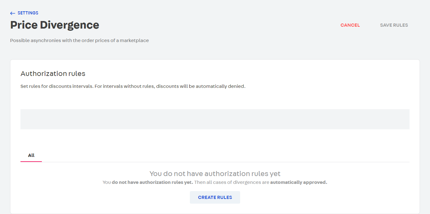 If you create a single authorization rule and it is less than 100%, orders with price variation outside the configured limit will not be integrated.