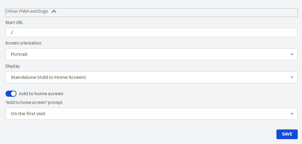 • Add to home screen: When activated, it allows the user to install the PWA.