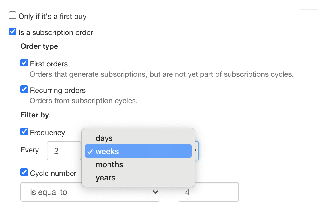 • Frequency: selection of the subscription order frequency valid for the promotion in days, weeks, months or years.
