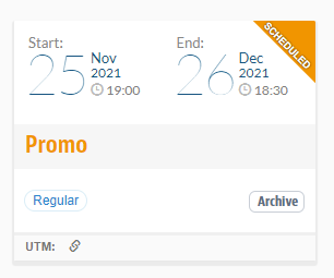 These promotions can be easily identified on the main Promotions page: they have an orange stripe with the word scheduled in the upper right corner of the card, as shown below.