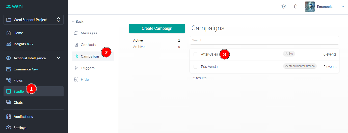 • Click on the ""Campaigns"" menu within the ""Studio"" module in the side menu and select the campaign containing the event you'd like to edit.