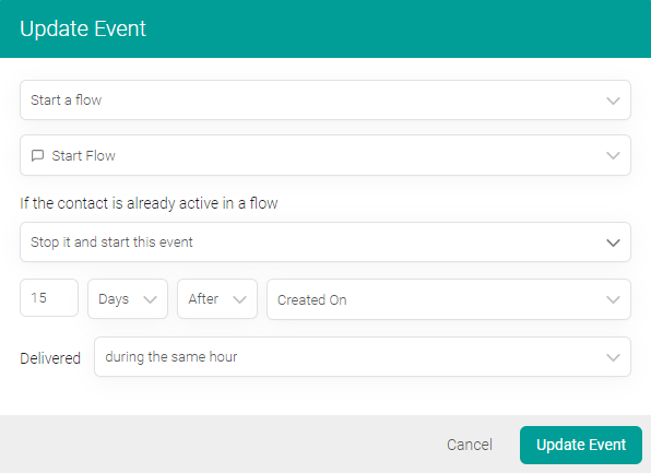 • In the event update dialog box, you can make the following changes:Select the option to send a message or start a flow