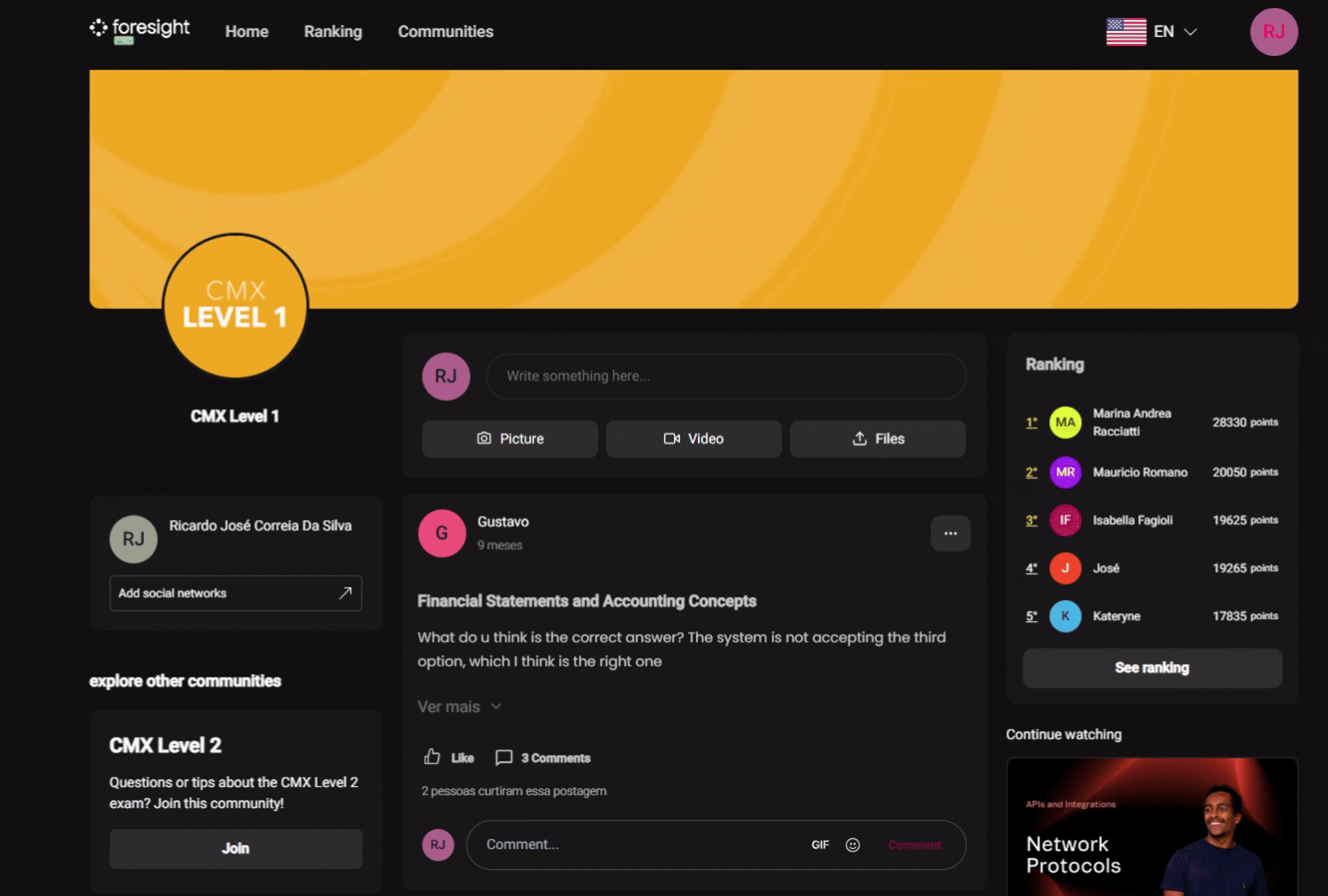 On the platform, you can access programs and content organized into modules and presented in video lessons, as well as credentials developed by the EICOM Institute, which tests the knowledge acquired during the programs in a secure environment.
