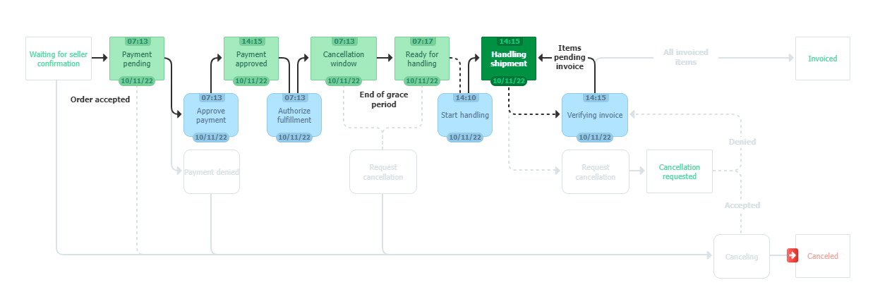 By default, in the new interface, a timeline with the Order status events is displayed, as in the image below: