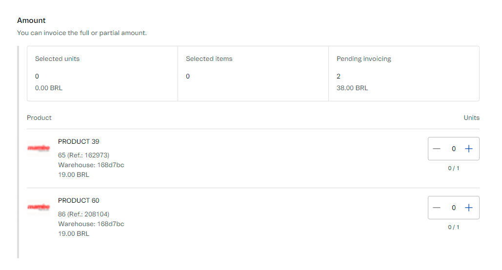 • **Submit invoice referencing items: **This option is exclusive to the new interface. It allows you to issue the invoice for all or specific items identified by SKU, inventory, and price. The following image shows an example: