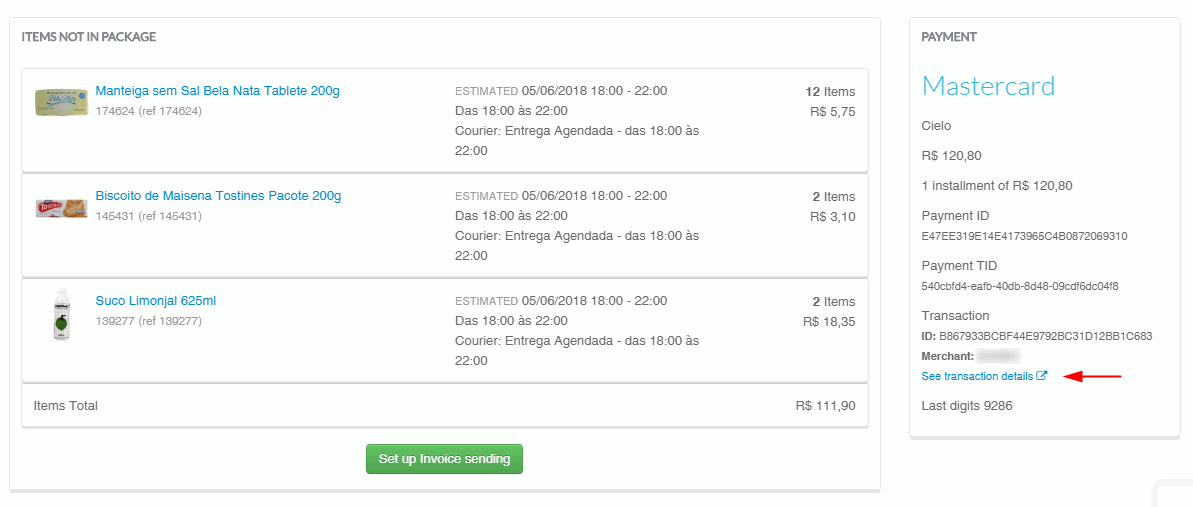 When you open an order, click "See transaction details" in the payment box: