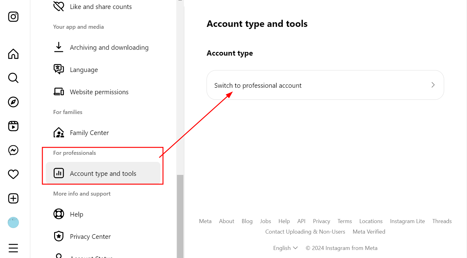 1. Go to settings, find Account type and tools, tap Switch to professional account.
