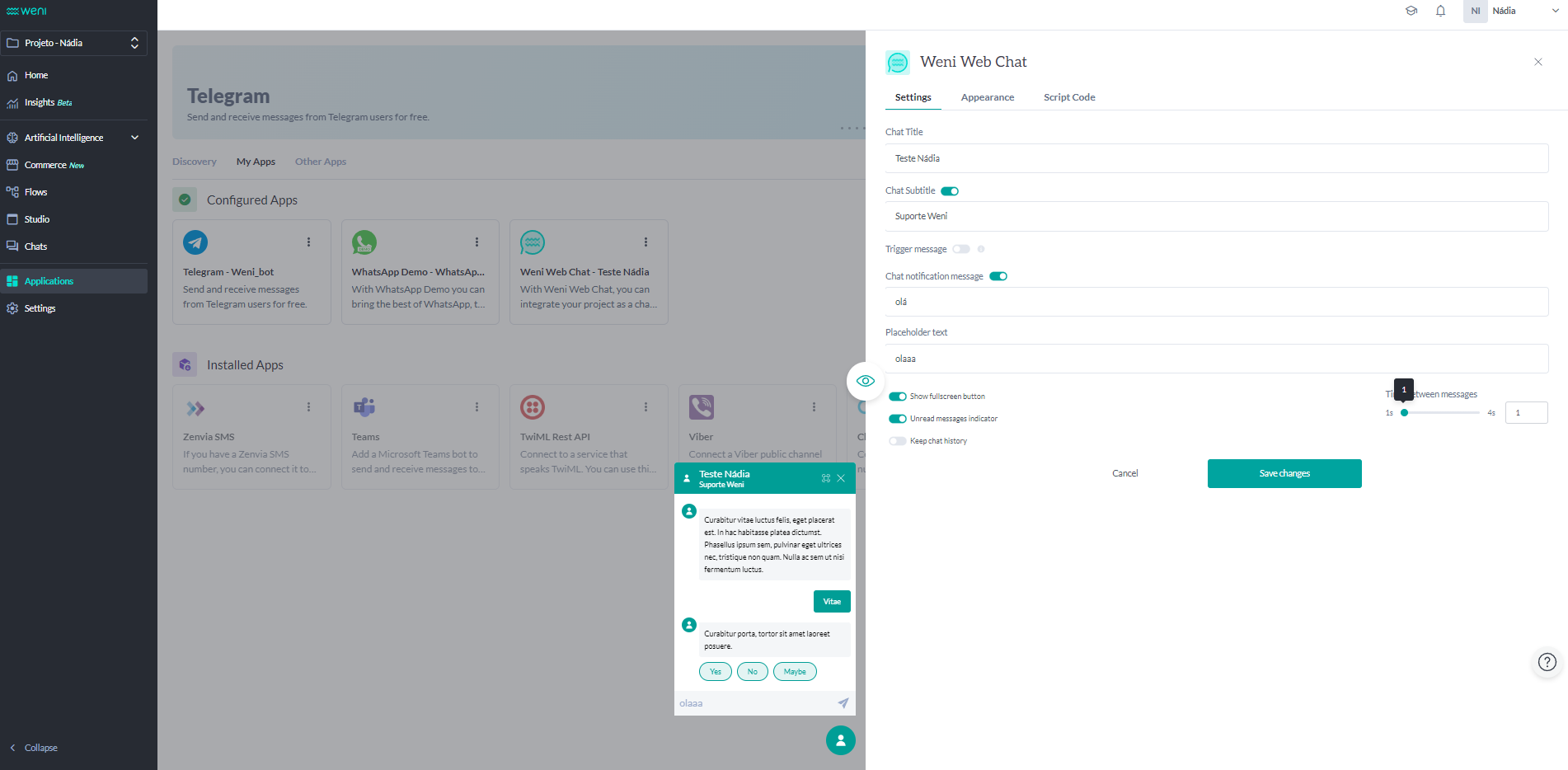 When integrating the web channel, you can customize aspects of the Web Chat such as color, message spacing time, message indicators, avatar, and much more! This way, you ensure that the Weni Platform offers everything tailored to your brand. Below, we’ll guide you step by step to complete the integration.​