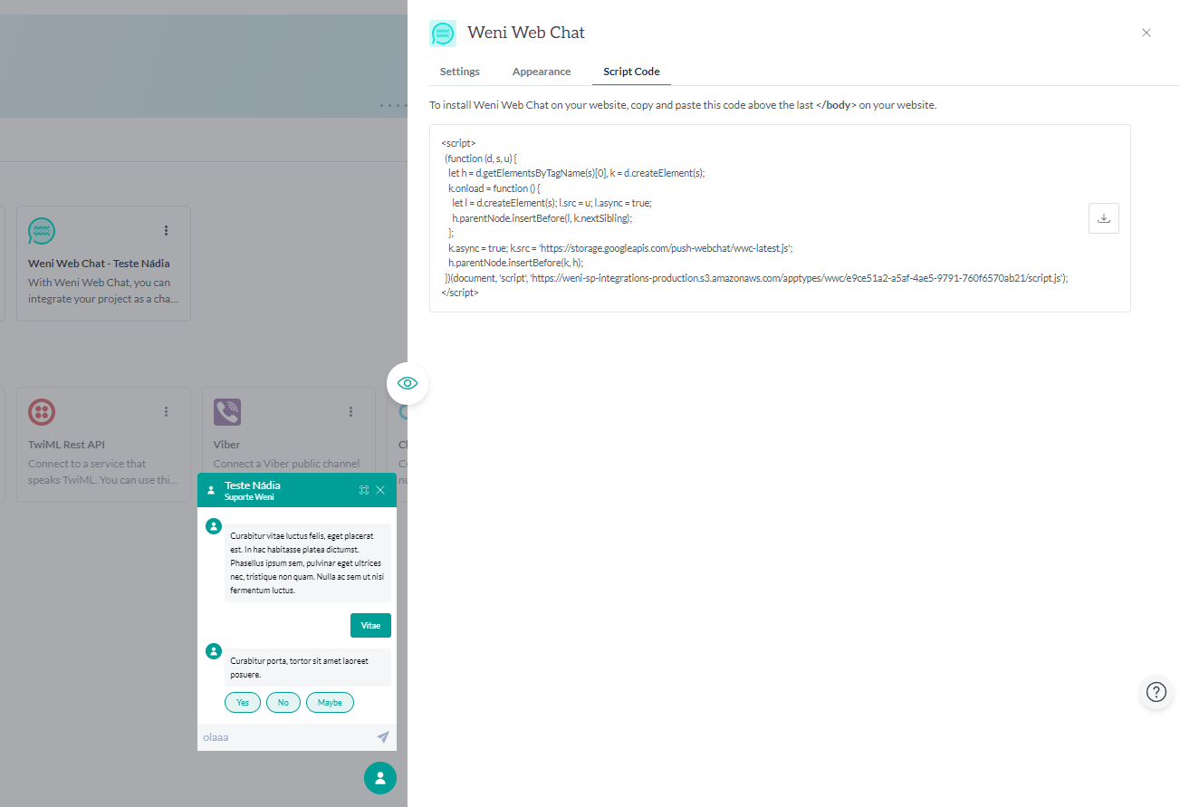 1. After completing the customization, to install the Weni Web Chat on your website, copy the code that will appear when you click on script code, and paste it above the last </body> tag on your website.