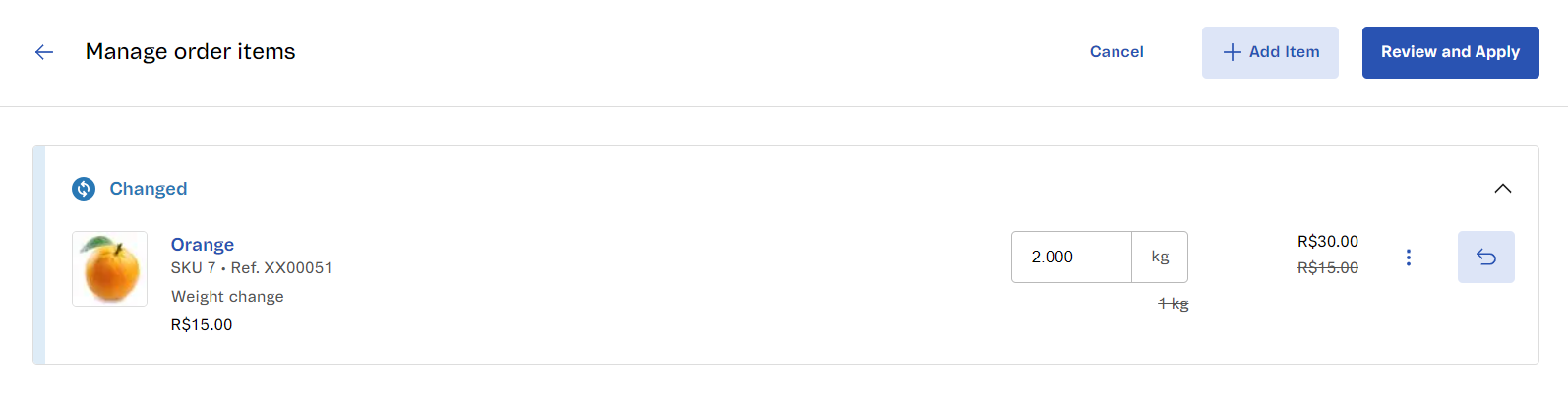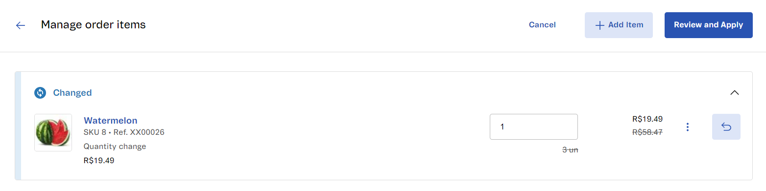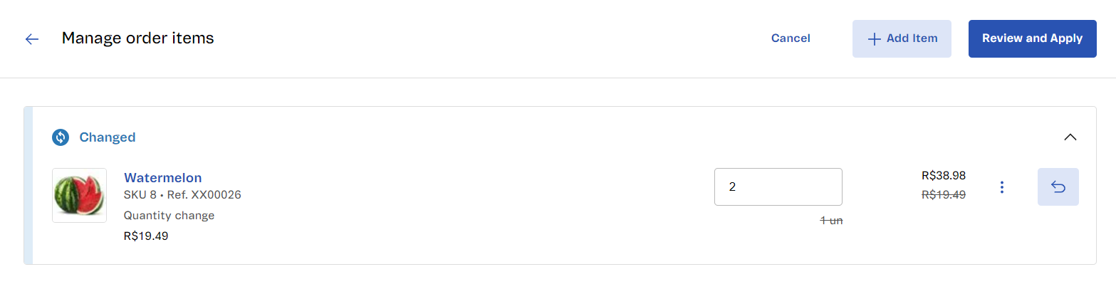 On the Manage order items page, you can undo a modification if you want. To do this, click the curved arrow icon Undo Action. After this, a confirmation message will be displayed: "Change undone", indicating that the action has been successfully reversed.