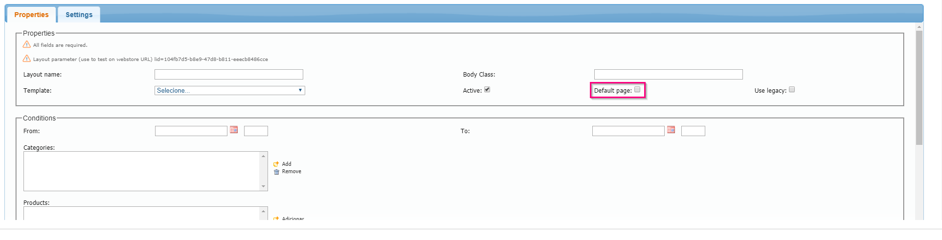 After filling in the Layout Name and Body Class fields, select the desired template on the Template box and uncheck the Default Page option. After that a new section will be available and you can define through the fields the conditions under which the new layout will be displayed in your store.