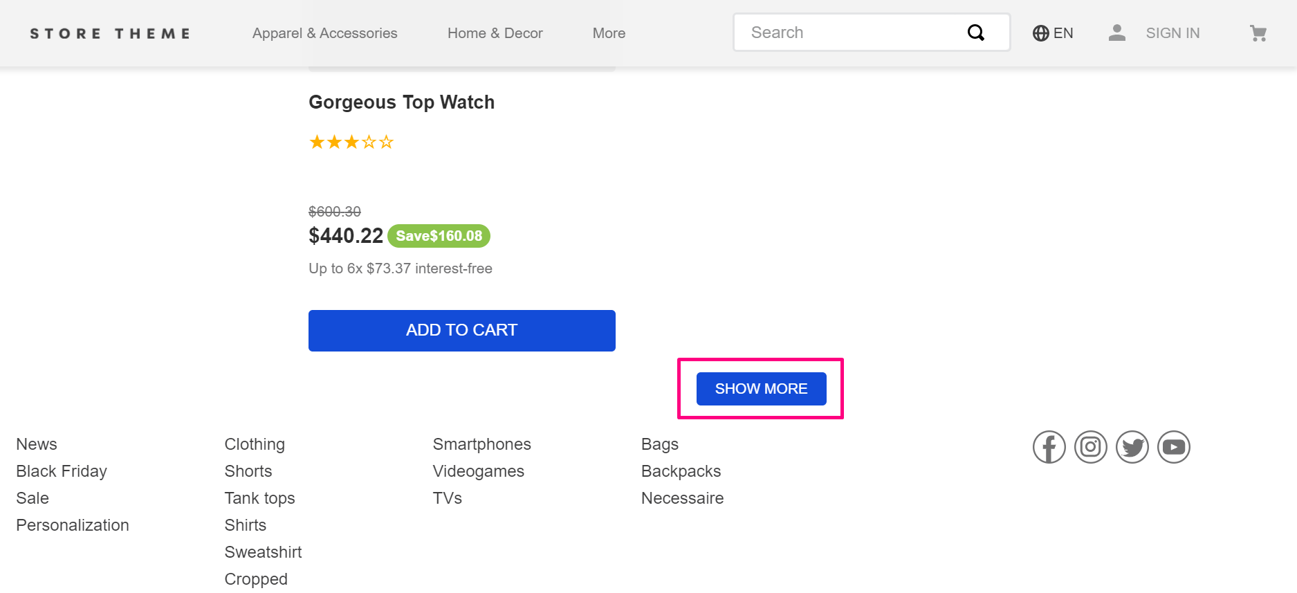 By following these step-by-step instructions, the style of the SHOW MORE and SHOW PREVIOUS buttons may be affected in stores that are already online. If you're building a new store, follow this tutorial before you start styling your store. If your store is already active, don't forget to check, at the end of this tutorial, if the style of the buttons is as expected.