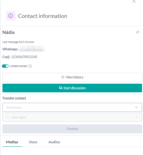 - Contact Information By clicking on the contact’s photo or name in any area of the conversation, you can access the contact information sidebar. This sidebar displays the contact’s profile photo in a larger size, data such as the communication channel the contact is using, the time of the last interaction, the option to transfer the chat, and the contact’s media gallery.