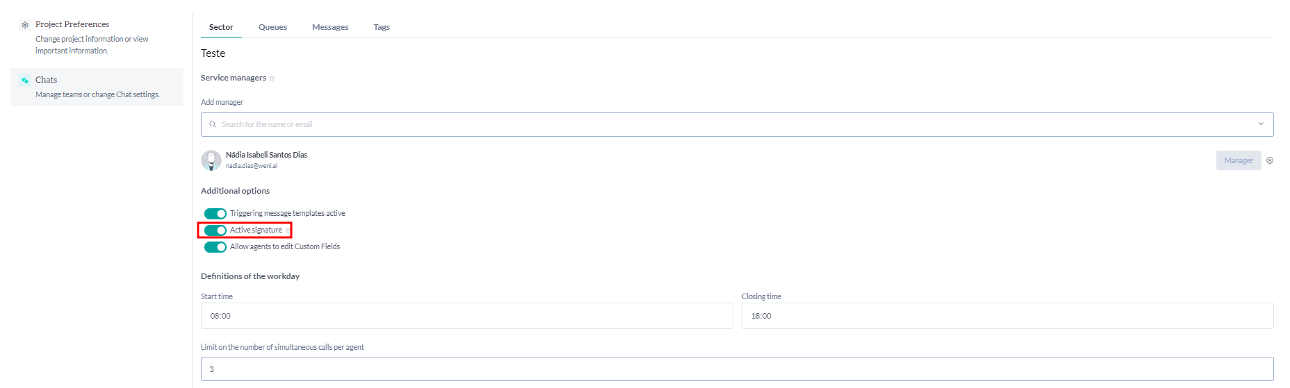 You can enable an active signature so that each message exchanged includes the name of the agent responding. To activate this function, go to Settings > Chats. Then, select the department you want to configure. Once inside the department, go to Additional Options and select Active Signature. See the image below: