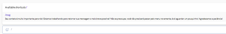 Shortcut: When registering the message, the agent assigns a keyword as a shortcut. To use it with the keyboard only, the agent should type the / (slash) key followed by the shortcut word.