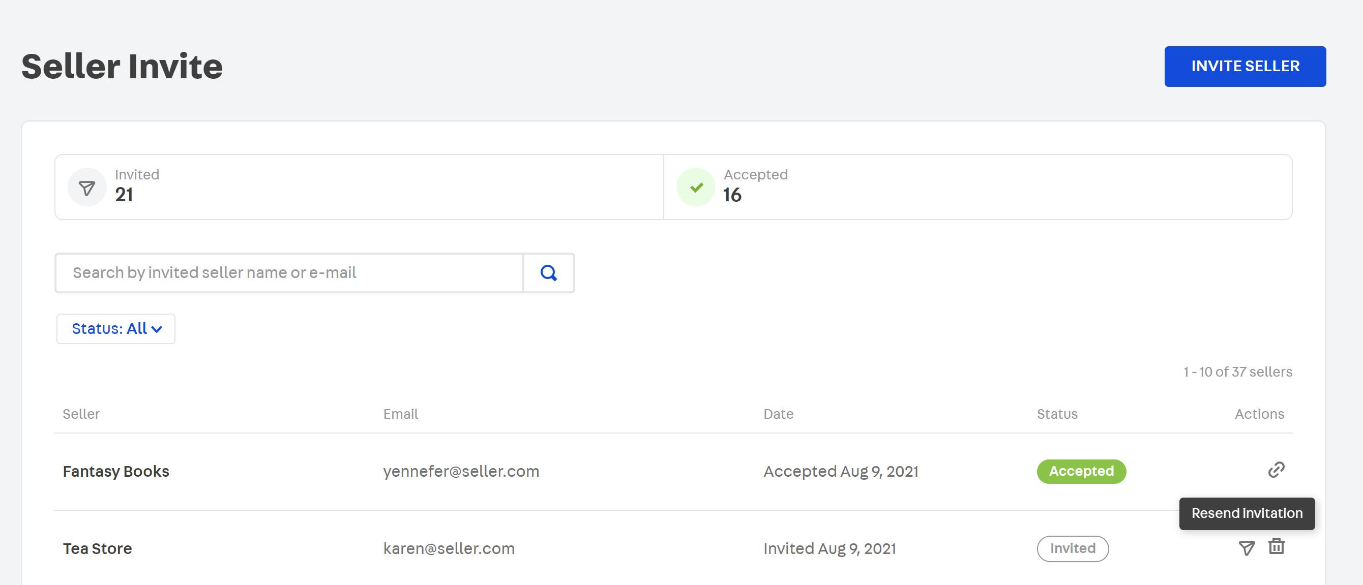 In addition to sending invitations, the page also displays a list of sellers to give visibility over the process. At the top of the list, you can search for sellers by name or email and filter results by status. Sellers can have two types of status: