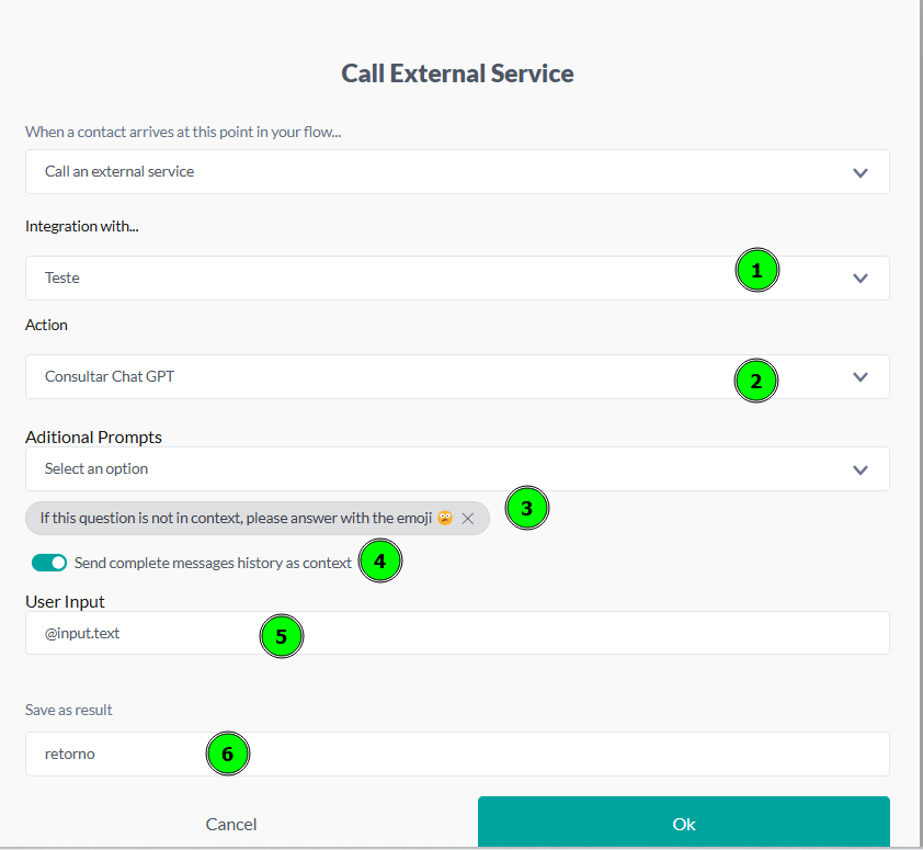 This list of principles is used to define which actions to take at the time of the response. It is also possible to create a prompt so that if the question is out of context, ChatGPT responds only with a character or emoji, and you handle that response in the flow to direct it to human assistance or as you prefer: