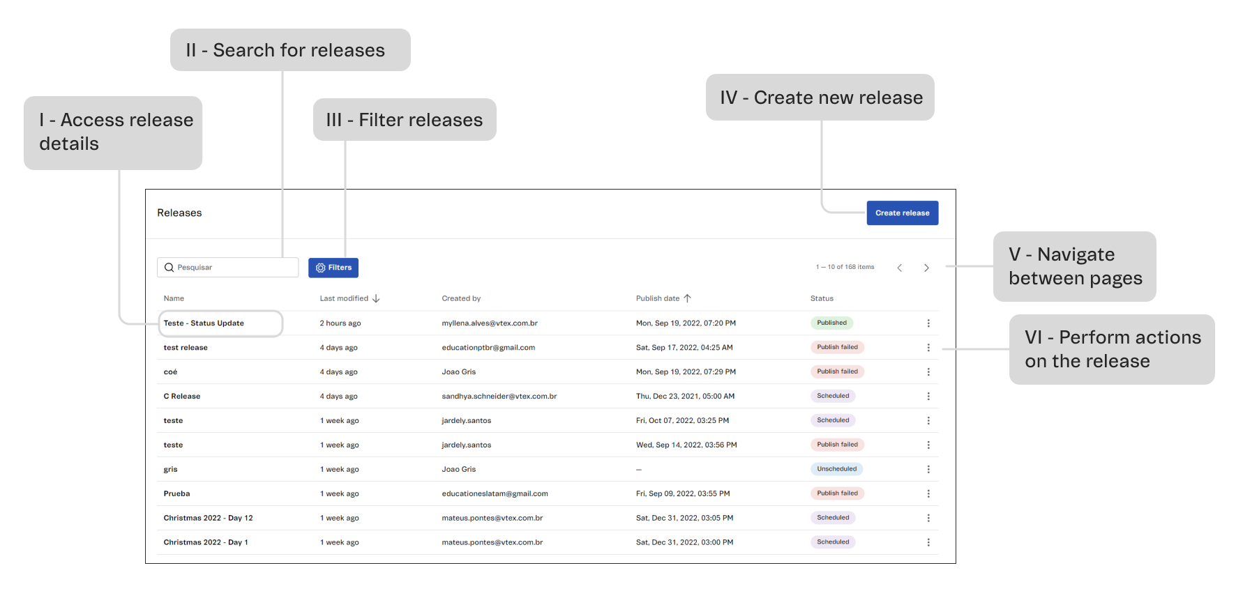 III - Filter releases: To filter by release status, use the Status button and choose the desired option. To filter by scheduled date or publication date, click on Date and choose the desired date.