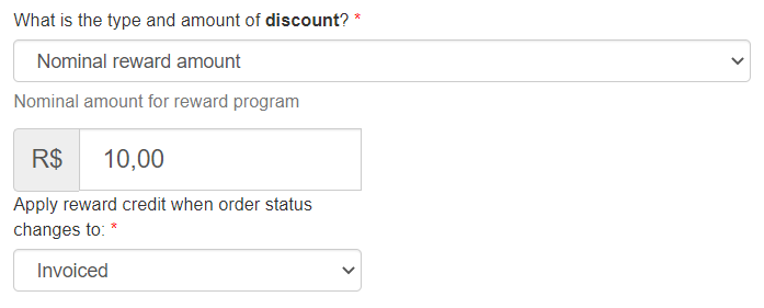 • Nominal value for rewards program: Credit amount that will be added to the customer's account in your store.