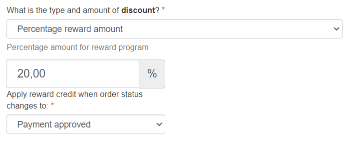 In the following example, customers will earn 20% of the purchase value when the order status changes to Payment Approved.