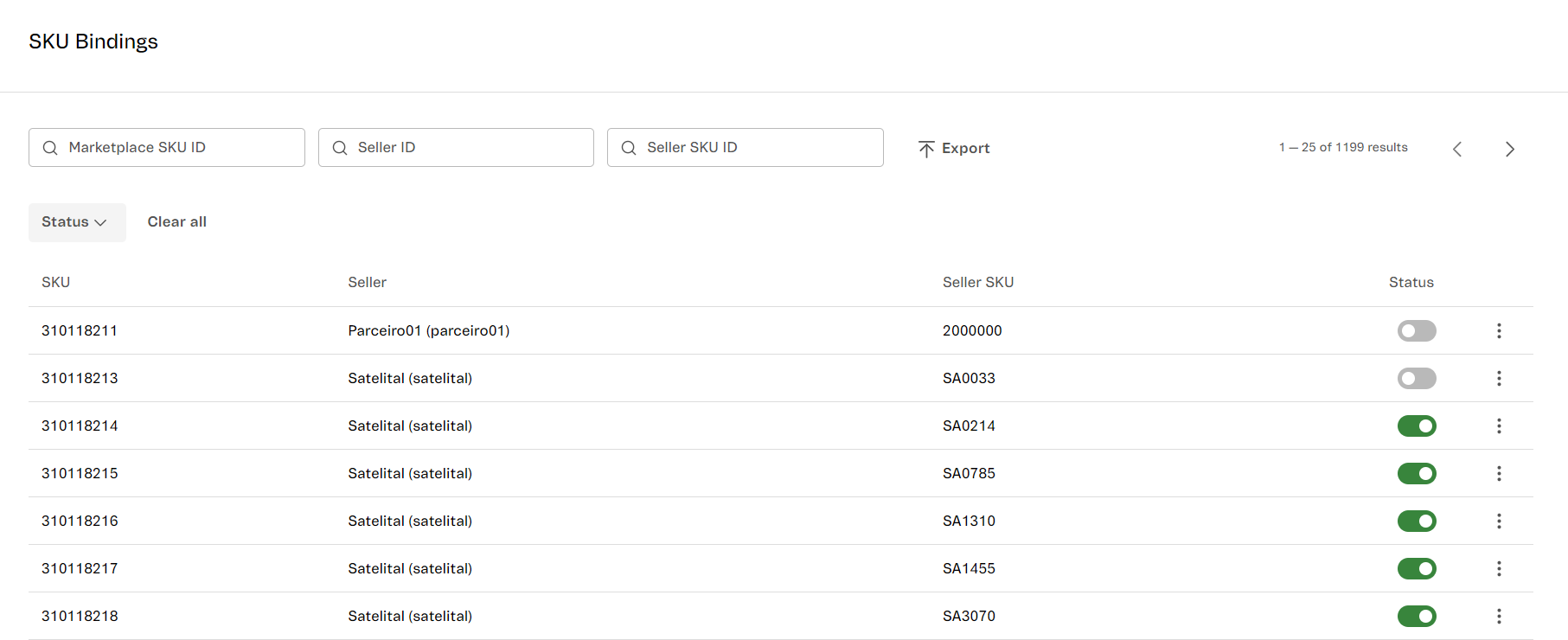 Once the marketplace has cataloged the SKUs, either via the Received SKUs page or by using the VTEX Matcher, the bindings between the seller’s SKUs and the marketplace SKUs appear on the SKU Bindings page. Bindings will automatically have the Bind status.