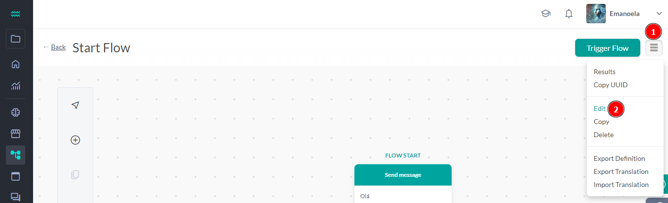 • Click on the three-line icon in the upper right corner of the flow editor, and then click on the ""Edit"" option.