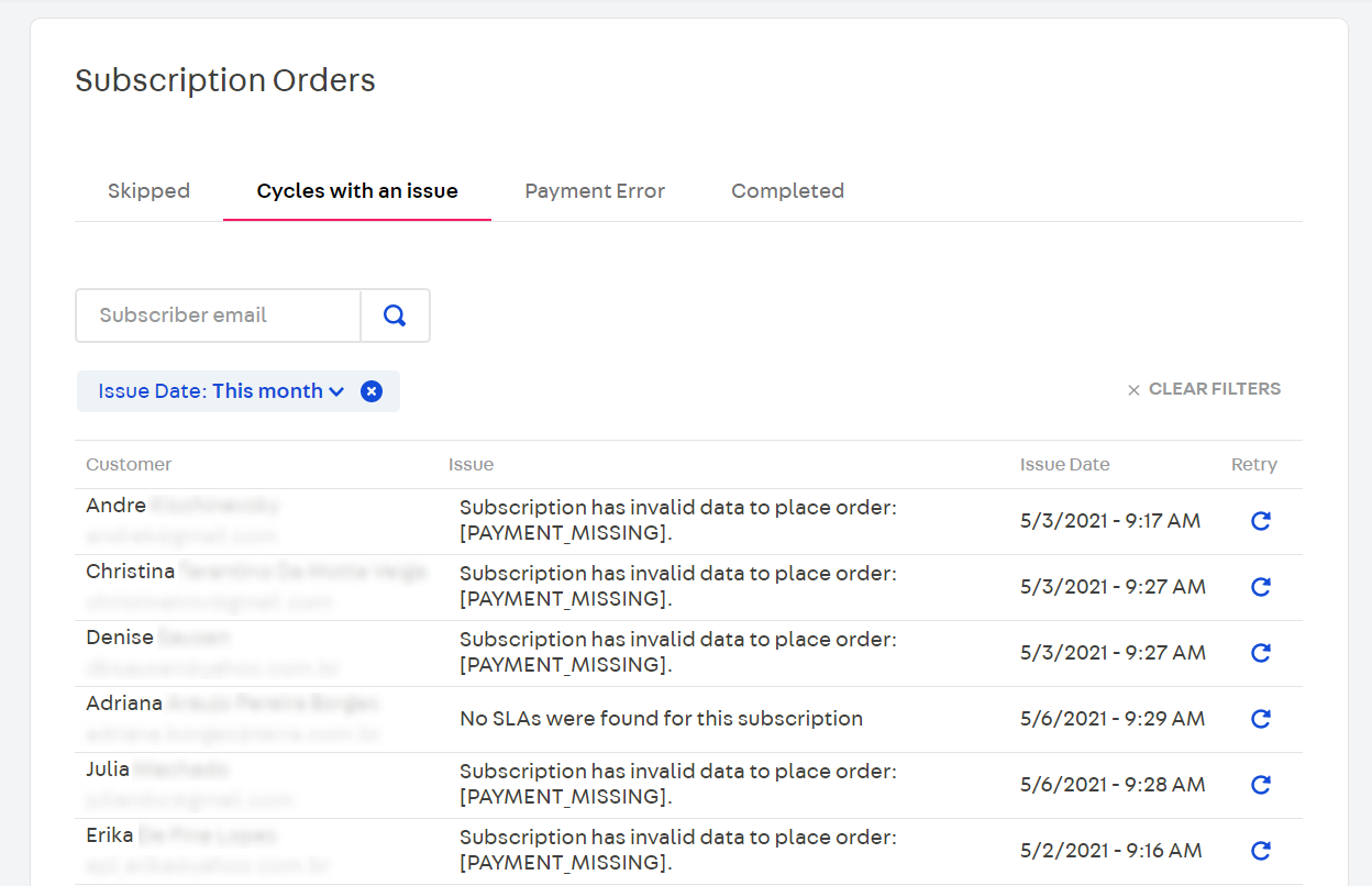 6. Then, go to Subscriptions > Dashboards > Subscription Orders > Cycles with an issue and click the button in the Retry column. If the retry option works, the order will be created in the Orders management module.