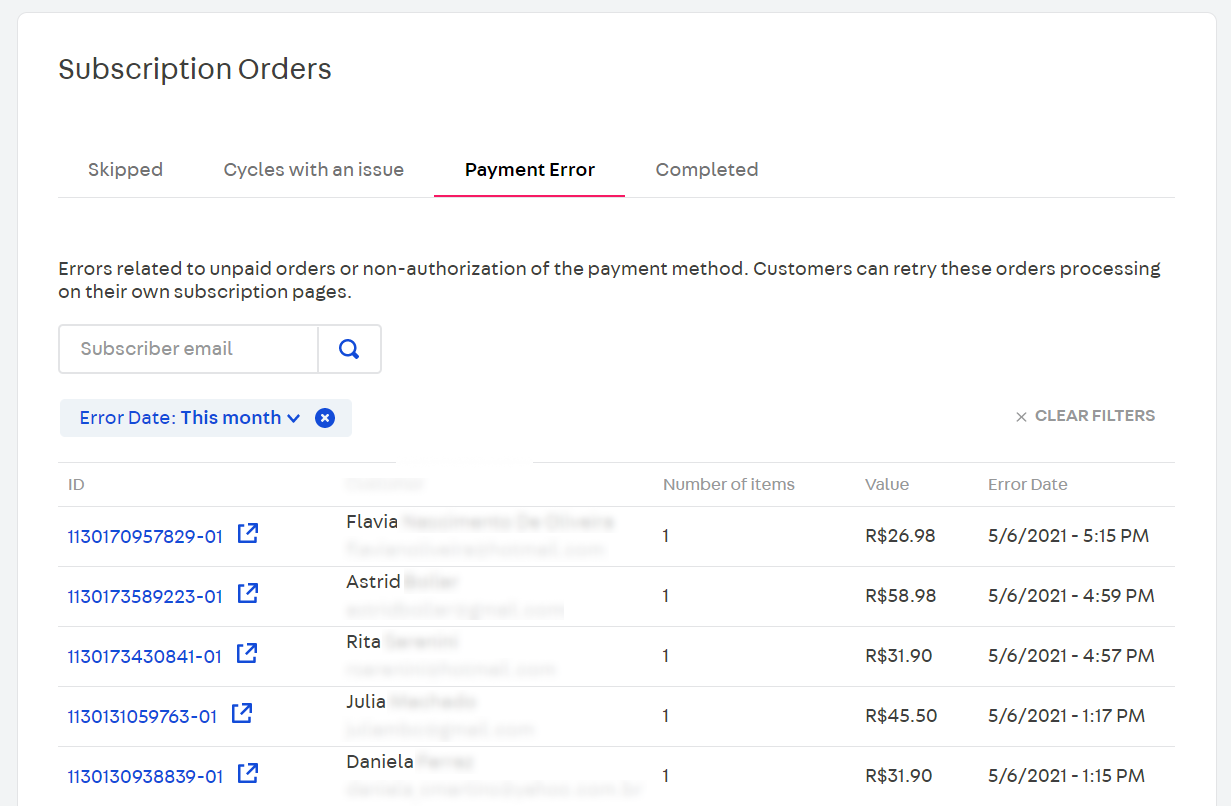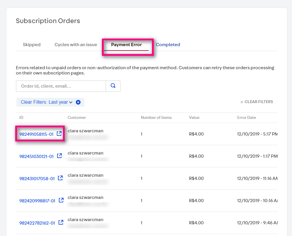 3. In the Subscription Orders section, click on the Payment Error tab.
