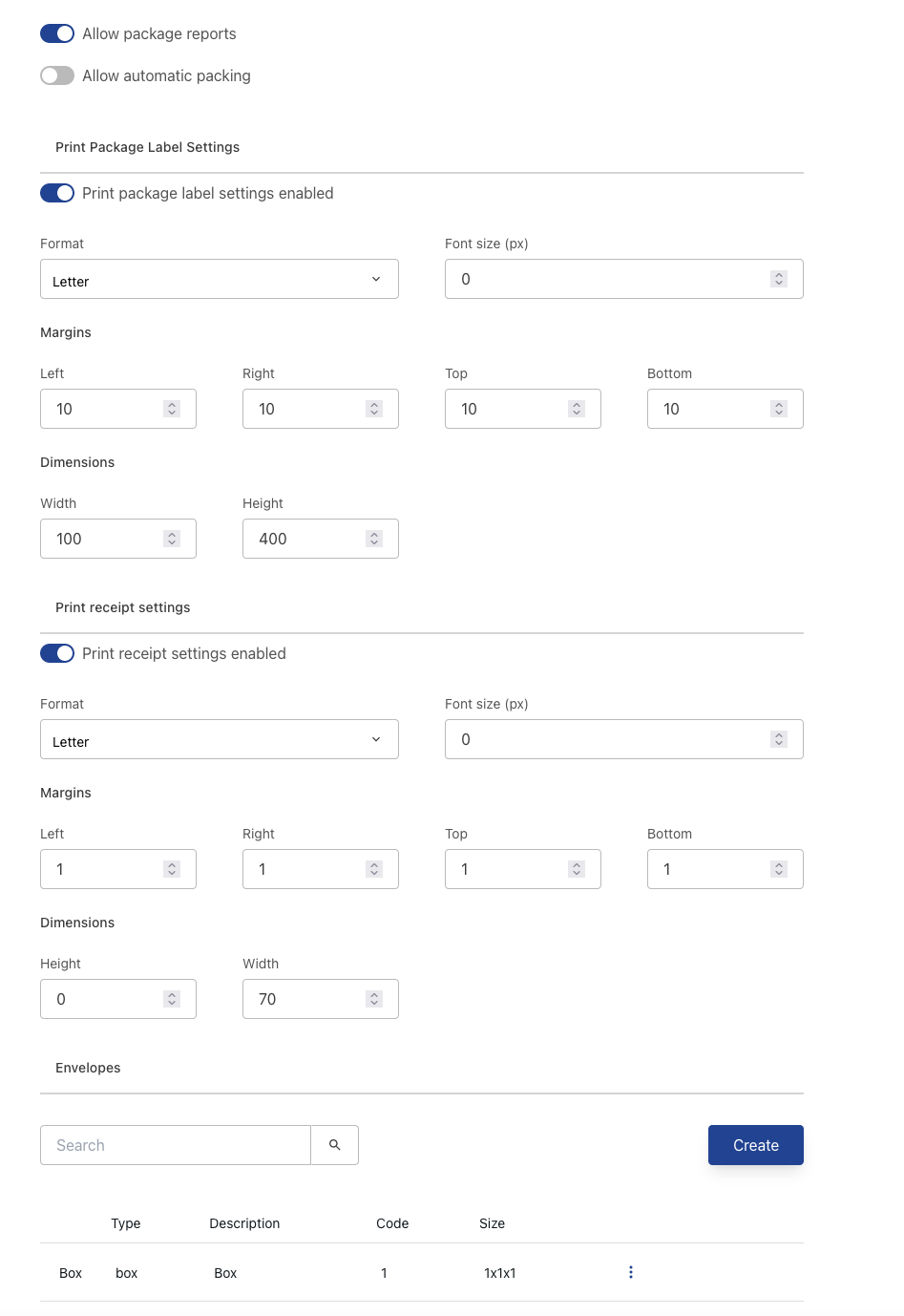 - Print package label settings enabled: Enables or disables the option to edit the label characteristics.