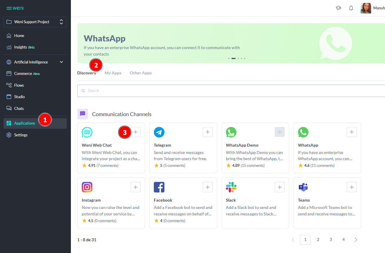 1. In your project, click on Applications > Discoveries > Add the Weni Web Chat channel.
