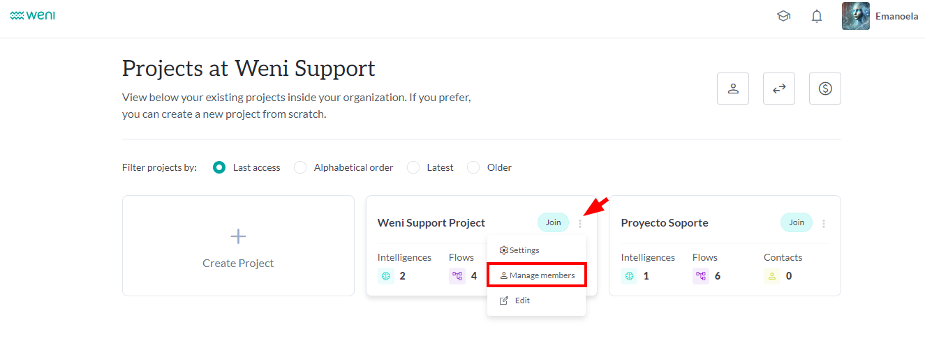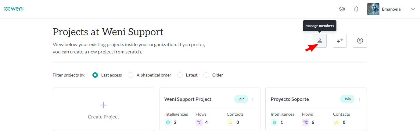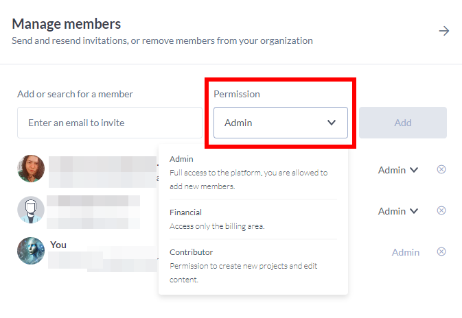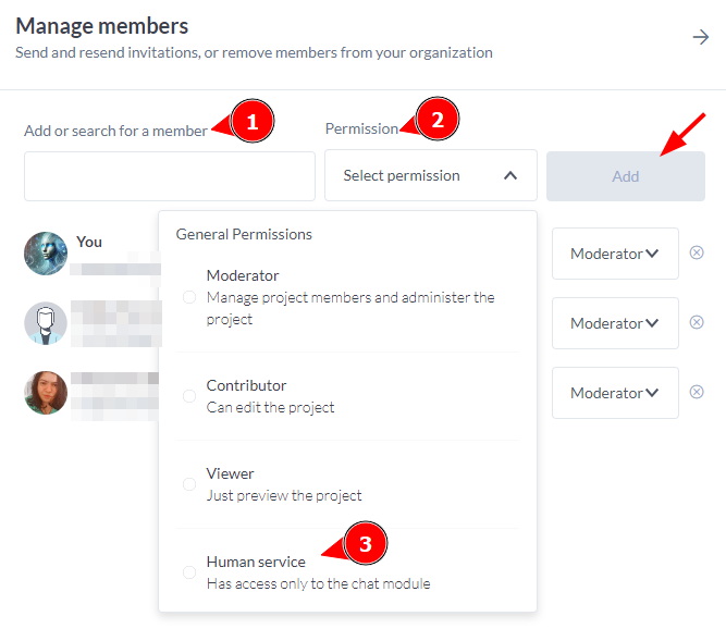 Click the manage members button in the Weni platform organization > Enter the email > Select the type of permission and click add in the Weni platform organization.