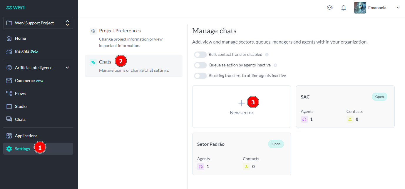 To add a department in Weni Chats, you need to go to the Settings module > Chats > New Department.