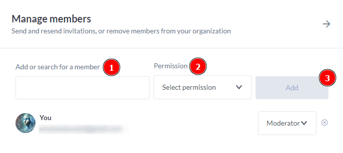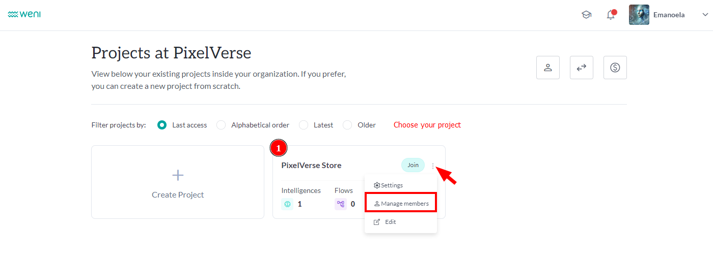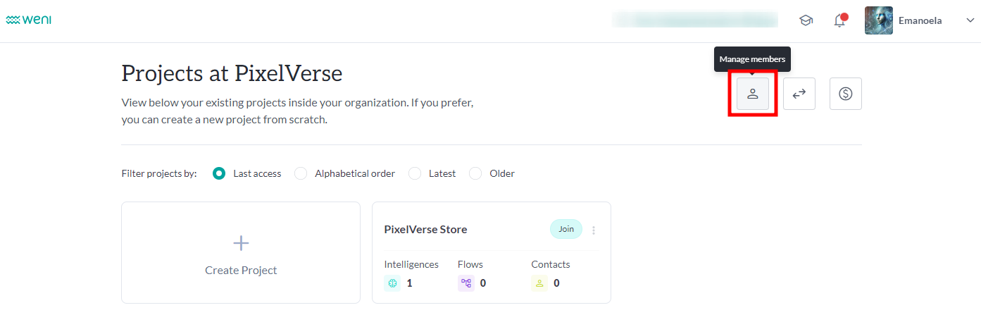 It is also possible to assign permissions to a specific project, without granting access to the entire organization. To access these options, simply click on the "Manage Members" option located in the upper right corner of the specific project.