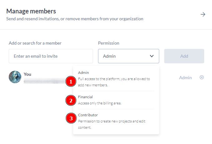 A new screen will open, displaying all the project's collaborators. Here, you can add, remove, and change the permissions of each project member individually.