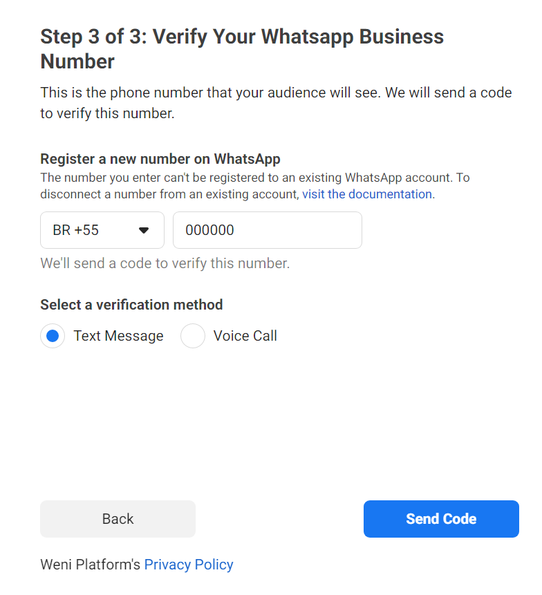 Once this is done, you'll see the screen to start step 3. In this step, you need to verify your registered WhatsApp Business number. Simply enter your number and select the method by which you want to receive the verification code: