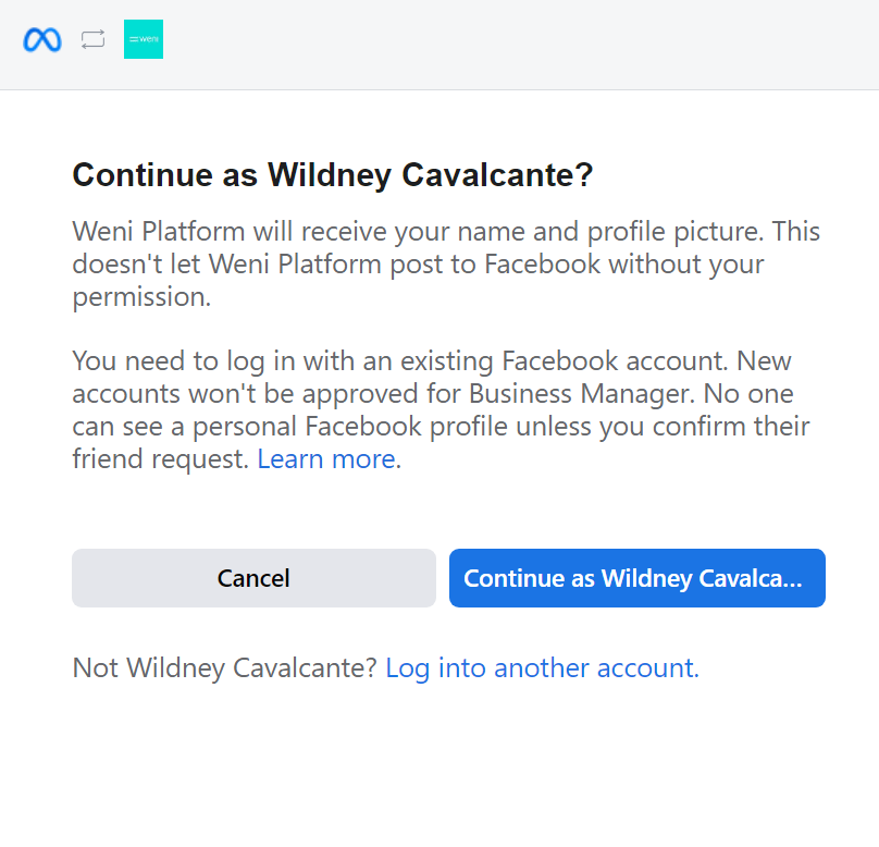 Accept the permissions, as they are necessary for Weni Platform to access your WhatsApp Business account, enabling you to use our integrations. But don’t worry! No data will be shared, and the entire process is very secure!