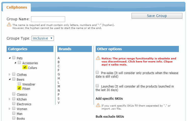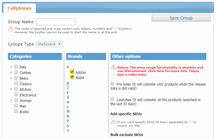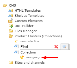 Choosing the products that will make up a collection is done by clicking on New Group in the desired collection, creating a group.