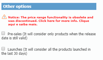 In the Other options section, the Pre-sales and Launches options are add-ons to choosing products by Category, Brand or SKU, meaning that these flags will only work if you have previously selected them.