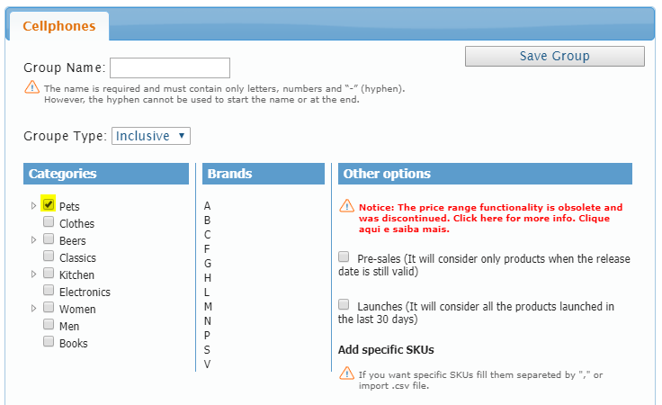 To add the products of a specific department to a group, select the desired department and click on Save Group, as shown in the image below.