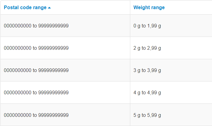 For example, for a given shipping rate, the weight range accepted by the shipping policy is 300 g to 500 g (as you can see in the table below), the weight-based additional charge is US$ 0.10. This means that for every gram the package exceeds the initial limit of 300 g, the cost will be increased by US$ 0.10.