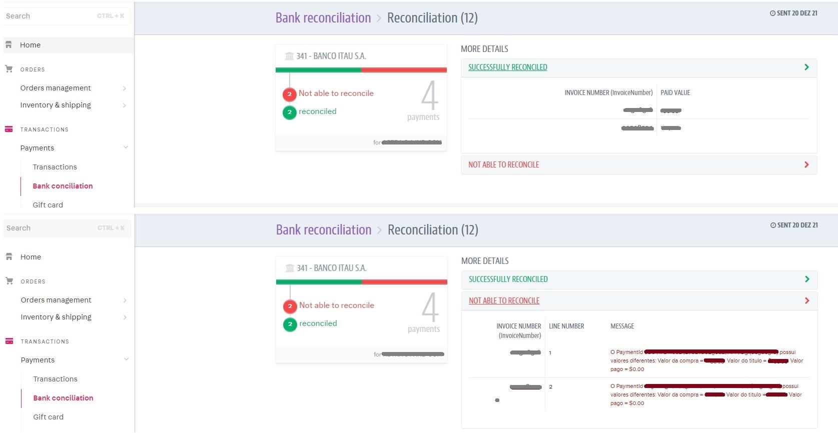 Among the details, it is possible to know the bank to which the slip belongs, the total payments involved, and exactly which recoveries (and their values) had success or not in the reconciliation.