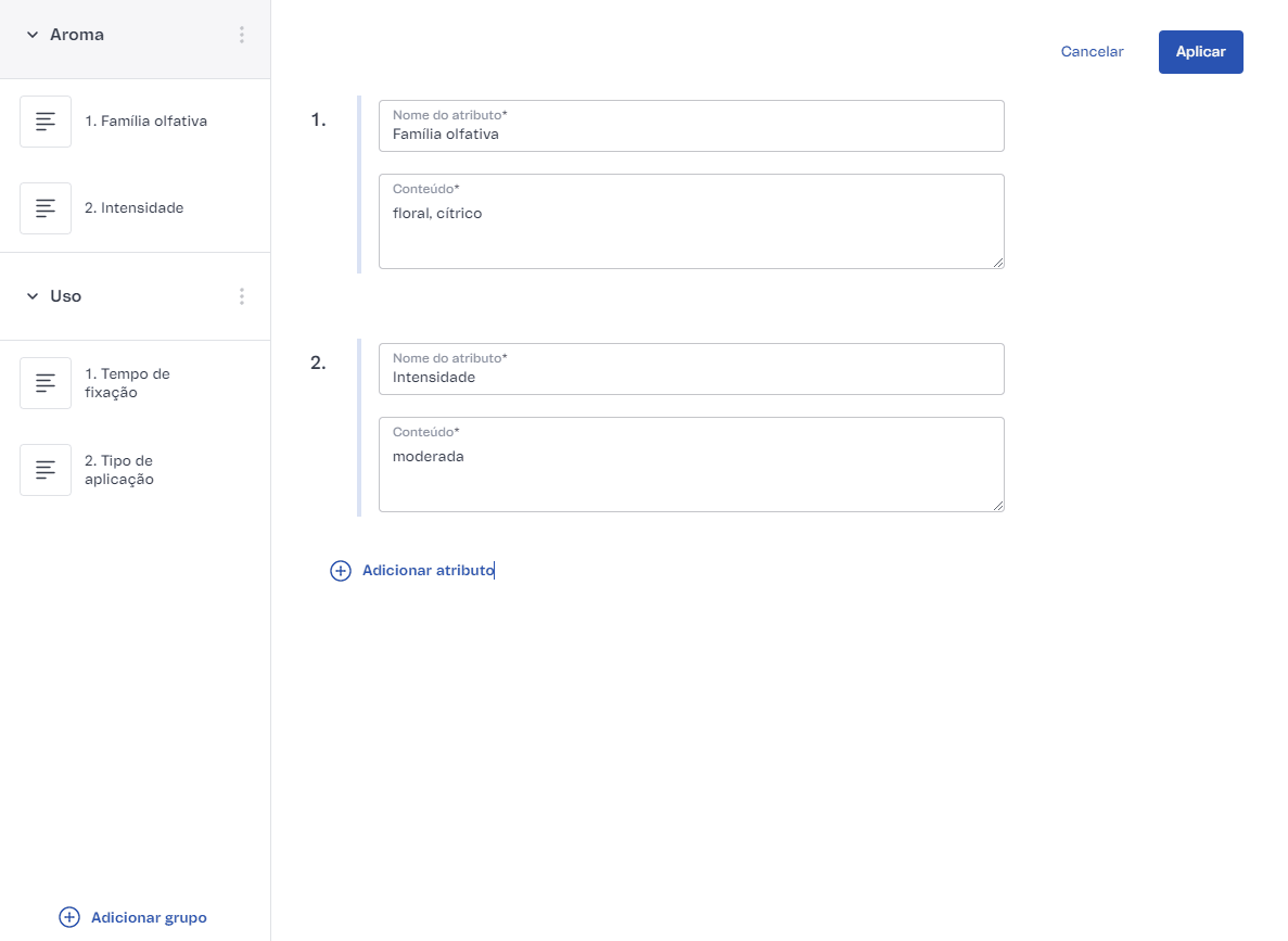 Os atributos são informações complementares e opcionais sobre o seu produto. Exemplo: um dos atributos de um perfume pode informar que o tipo de aplicação é spray.