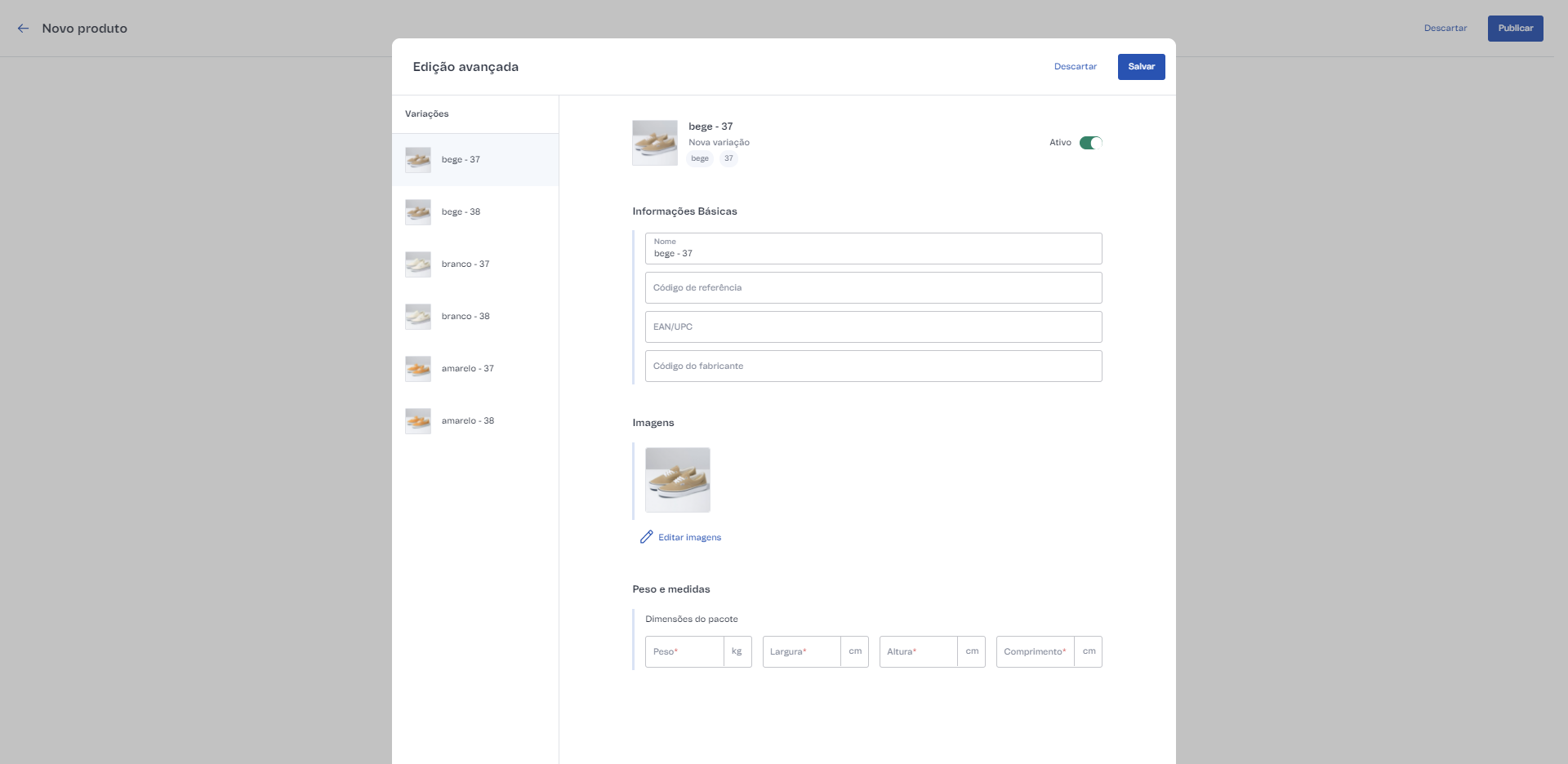 Ao clicar na seta (>), você pode visualizar e editar o Nome da variação e as demais informações correspondentes à variação. O botão Edição avançada permite acessar o painel de edição avançada de informações das variações do produto.