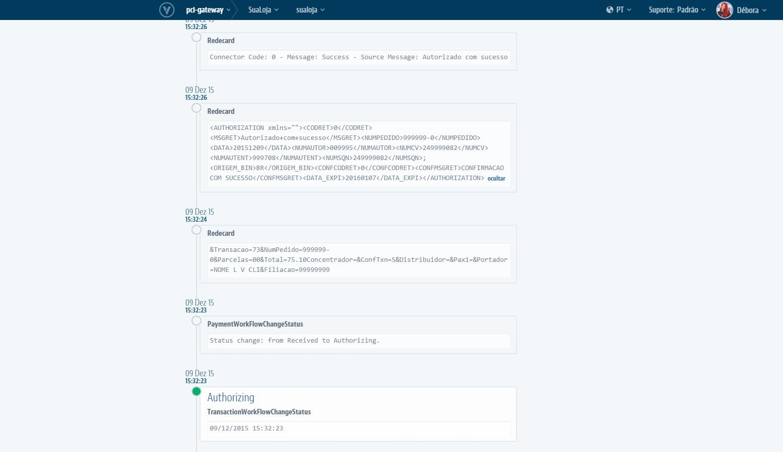The most important part of this screen is the transaction interaction log. Here, all VTEX communication with registered affiliates - anti-fraud, gateways and acquirers - is registered, including success and error messages, with their respective codes.